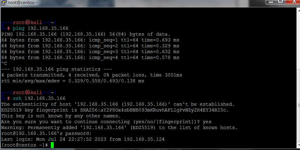 kali 에서 Cent OS 로 ping 도 나가고 ssh 접속도 가능