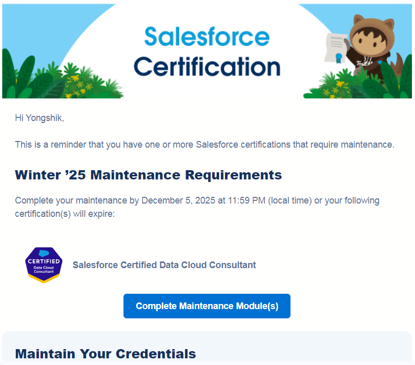 Salesforce 에서 한통의 이메일을 받았다. Your Salesforce Certification Maintenance is Due