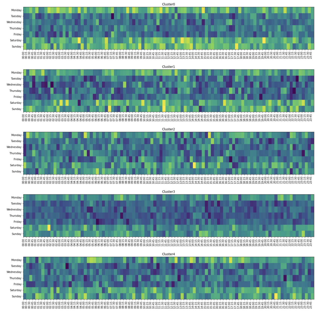 각 가구의 15분간격의 전력량의 합을 구하고 해당데이터를 바탕으로 총 5개의 군집으로 군집화를 진행한 후 아래의 그림과 같은 형태로 출력하라.